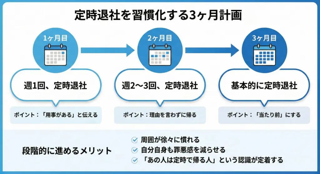段階的に定時退社を増やしていくことで、周囲も徐々に慣れていきます。また、「業務を終わらせて帰っている」ことが分かれば、周囲も納得しやすくなります。