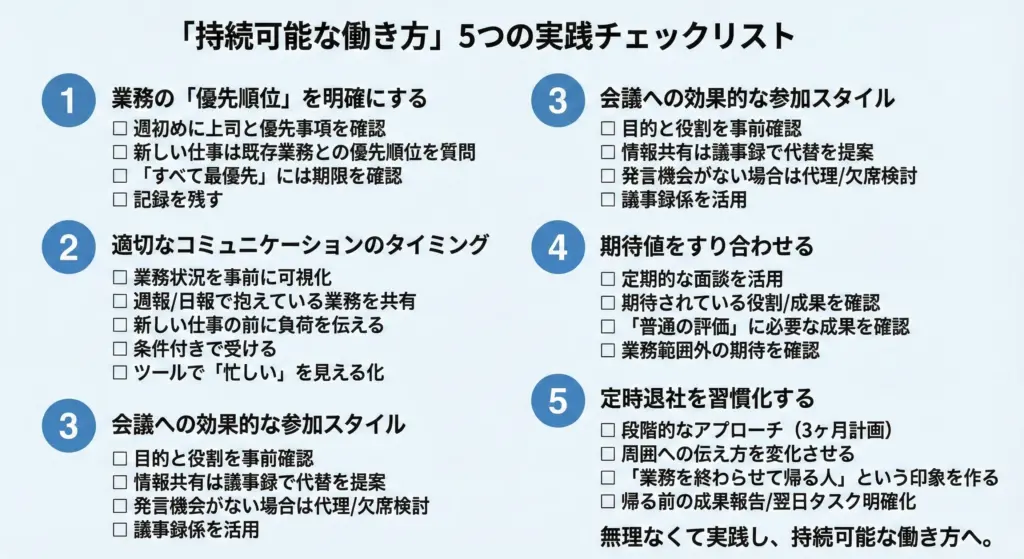 ここからは、日本の職場で無理なく実践できる具体的なポイントを紹介します。いきなりすべてを実践する必要はありません。自分に合ったものから、少しずつ始めてみてください。