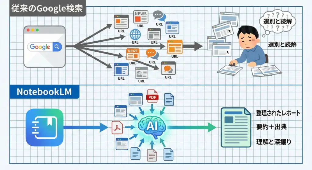 | 項目 | 従来のGoogle検索 | NotebookLM |