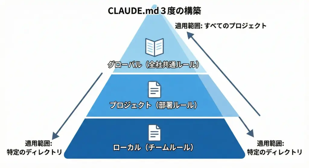 面白いのは、CLAUDE.mdには3つのレベルがあるという点です。
