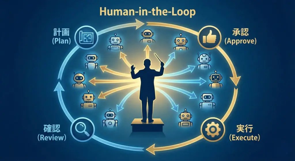 Claude Codeでも、重要な操作(ファイルの削除、外部APIの呼び出しなど)の前には確認が入ります。これは「Human-in-the-Loop」と呼ばれる設計思想です。