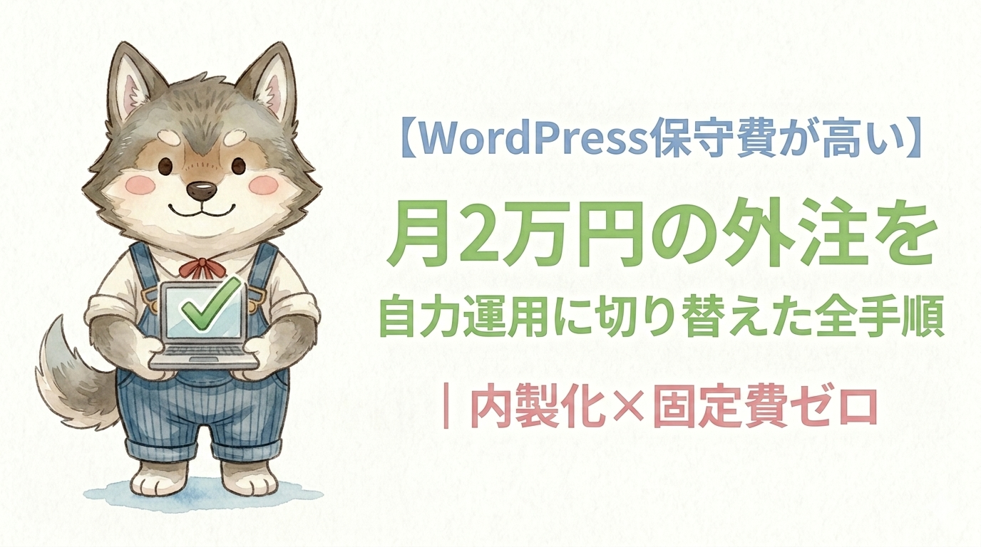 この記事は、WordPressの保守費用が高いと感じている個人事業主や小規模ビジネスのオーナーに向けて書いています。結論から言うと、WordPressの運用・保守は、いくつかのポイントを押さえれば自分でできます。外部に月額1〜3万円払い続ける必要はありません。ただし「全部自分でやれ」という話でもなくて、内製化の進め方と、本当に困ったときだけプロに頼れる体制の作り方を知っておくことが大事です。